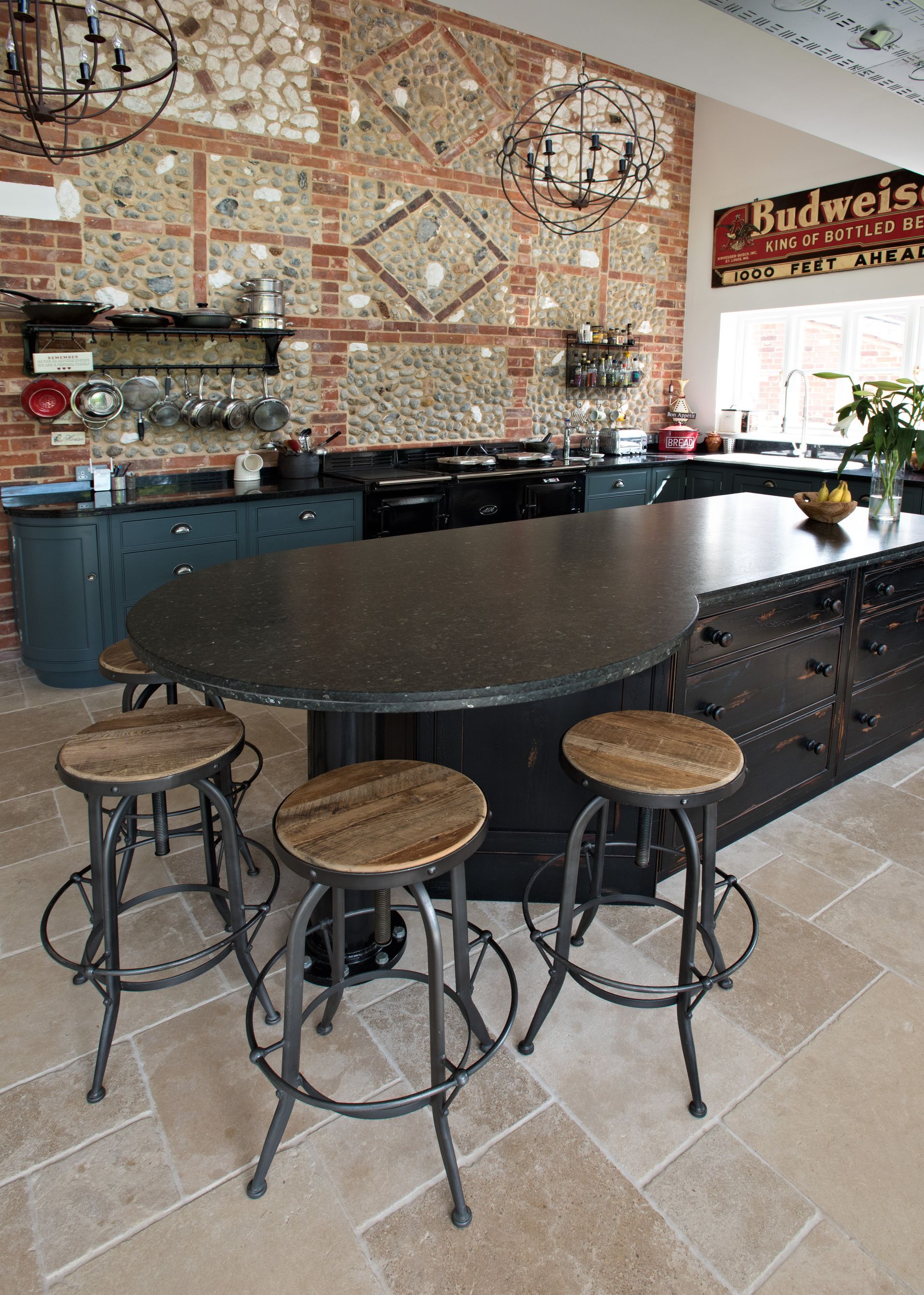 The backdrop of exposed brick and flint walls sets the tone for the entire space, adding warmth and texture. The quirky decor - from lighting to accessories - ties everything together, elevating the kitchen from functional to fabulous.