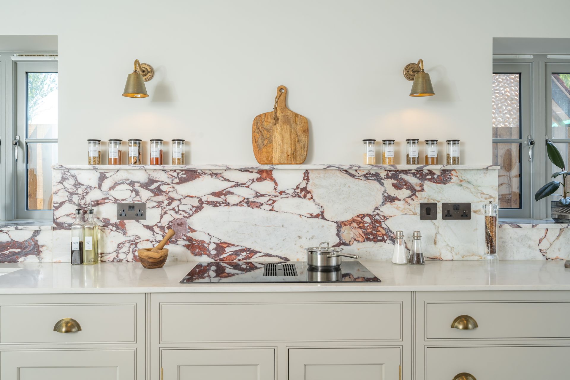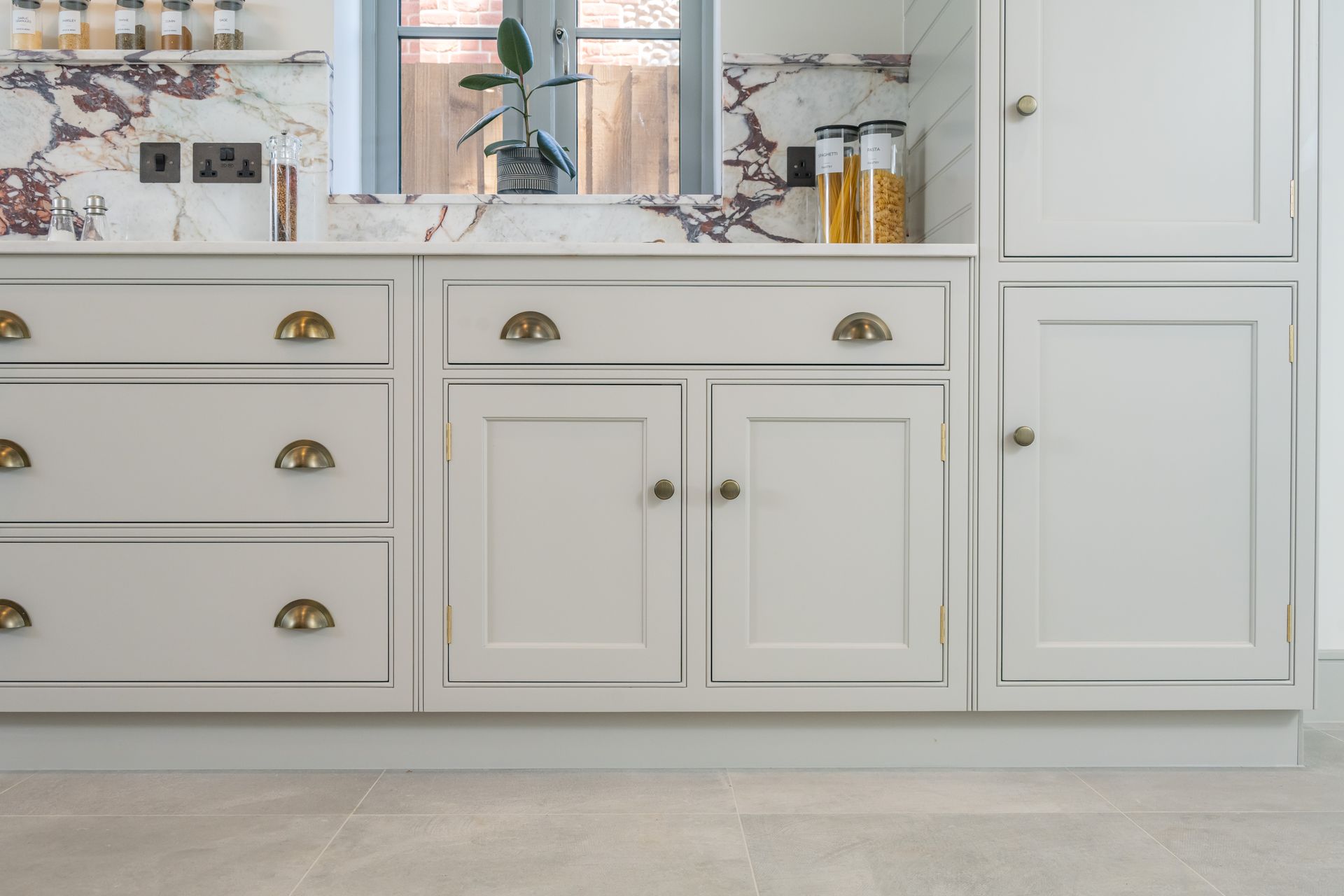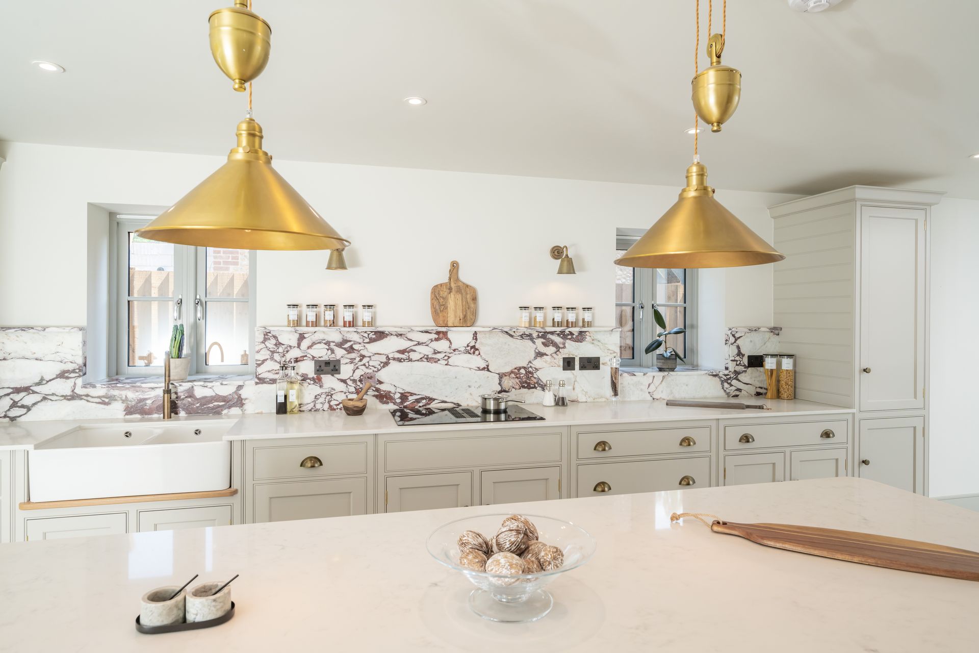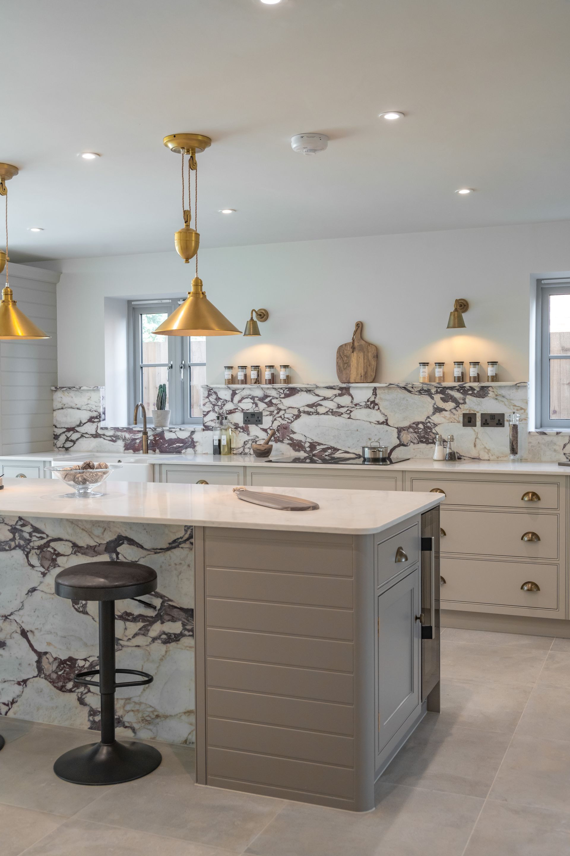 This project centres around our Plain Norfolk style, elevated with refined detailing and curated natural materials. The cabinetry was spray-painted in Farrow & Ball 'Purbeck Stone' and 'Charleston Gray', offering a warm yet neutral backdrop that allows the natural marble to take centre stage. Carrara Quartz worktops on the perimeter cabinetry complement the bold, book-matched marble cladding on the island and feature wall.
