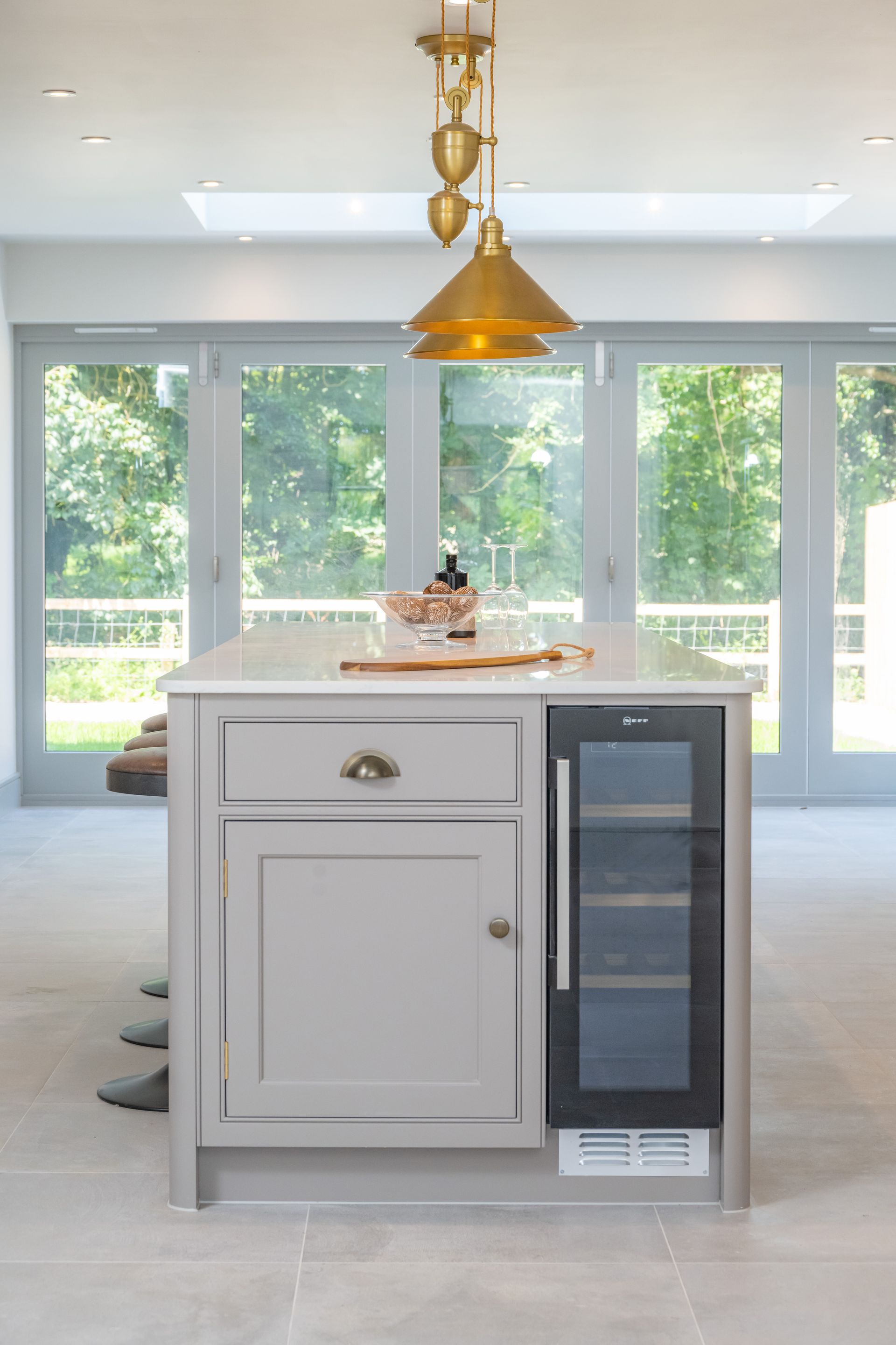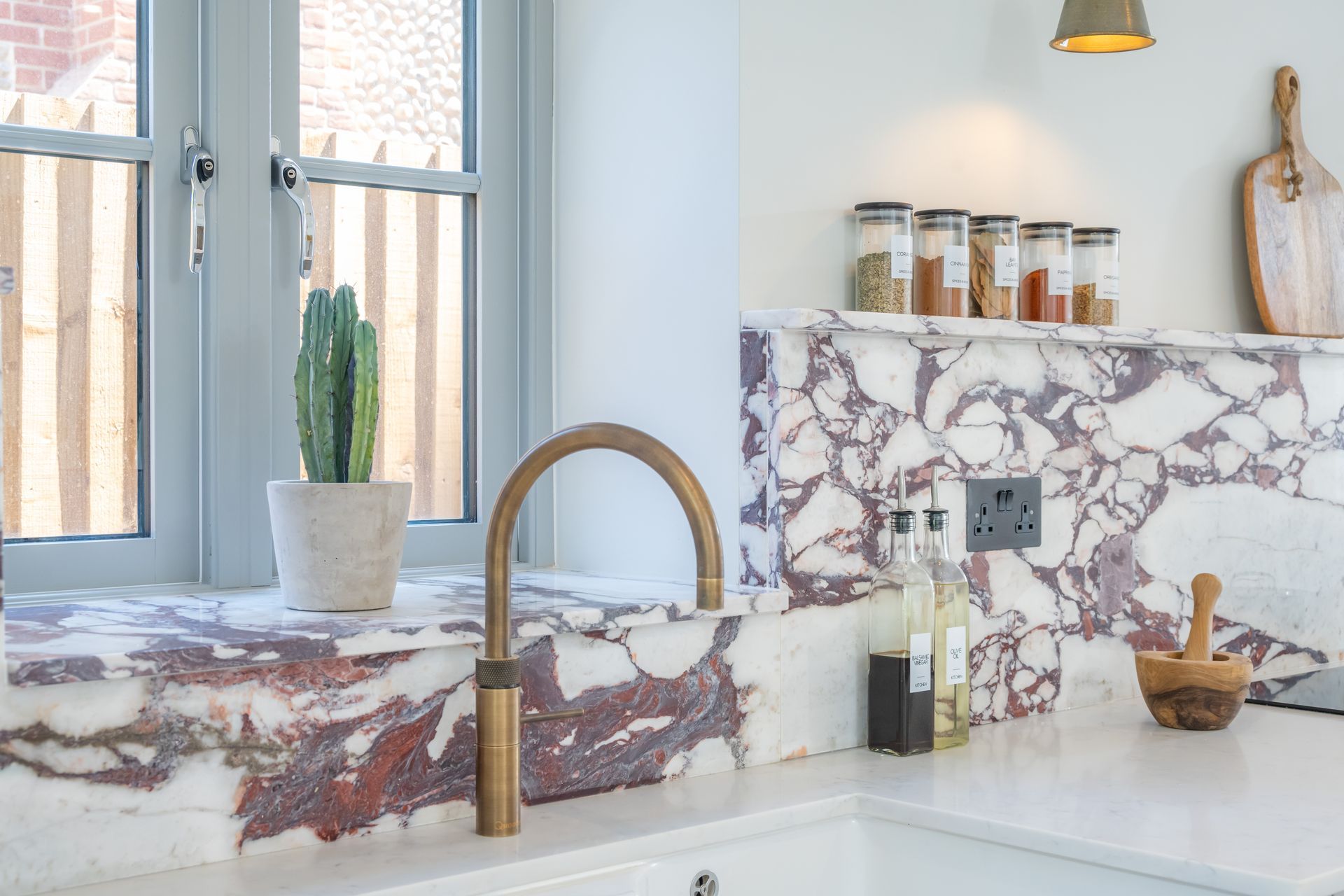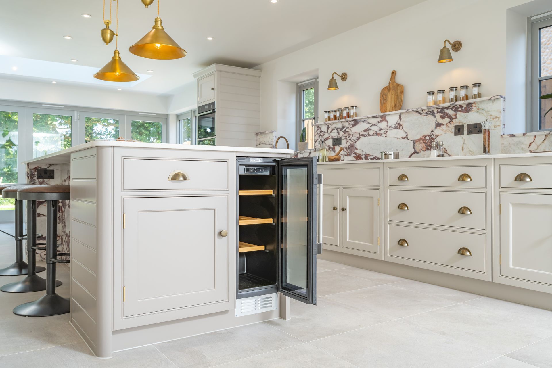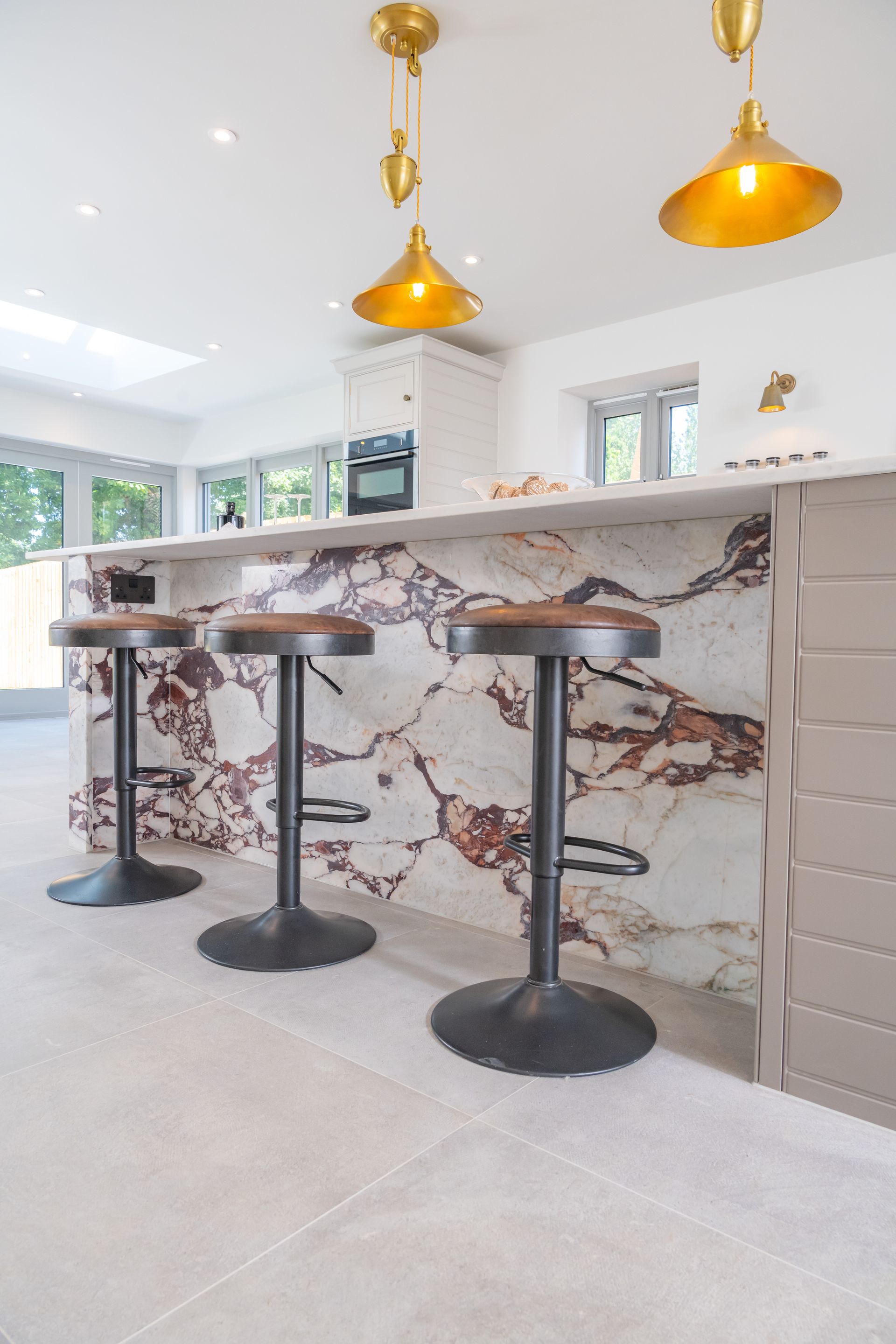 This project centres around our Plain Norfolk style, elevated with refined detailing and curated natural materials. The cabinetry was spray-painted in Farrow & Ball 'Purbeck Stone' and 'Charleston Gray', offering a warm yet neutral backdrop that allows the natural marble to take centre stage. Carrara Quartz worktops on the perimeter cabinetry complement the bold, book-matched marble cladding on the island and feature wall.
