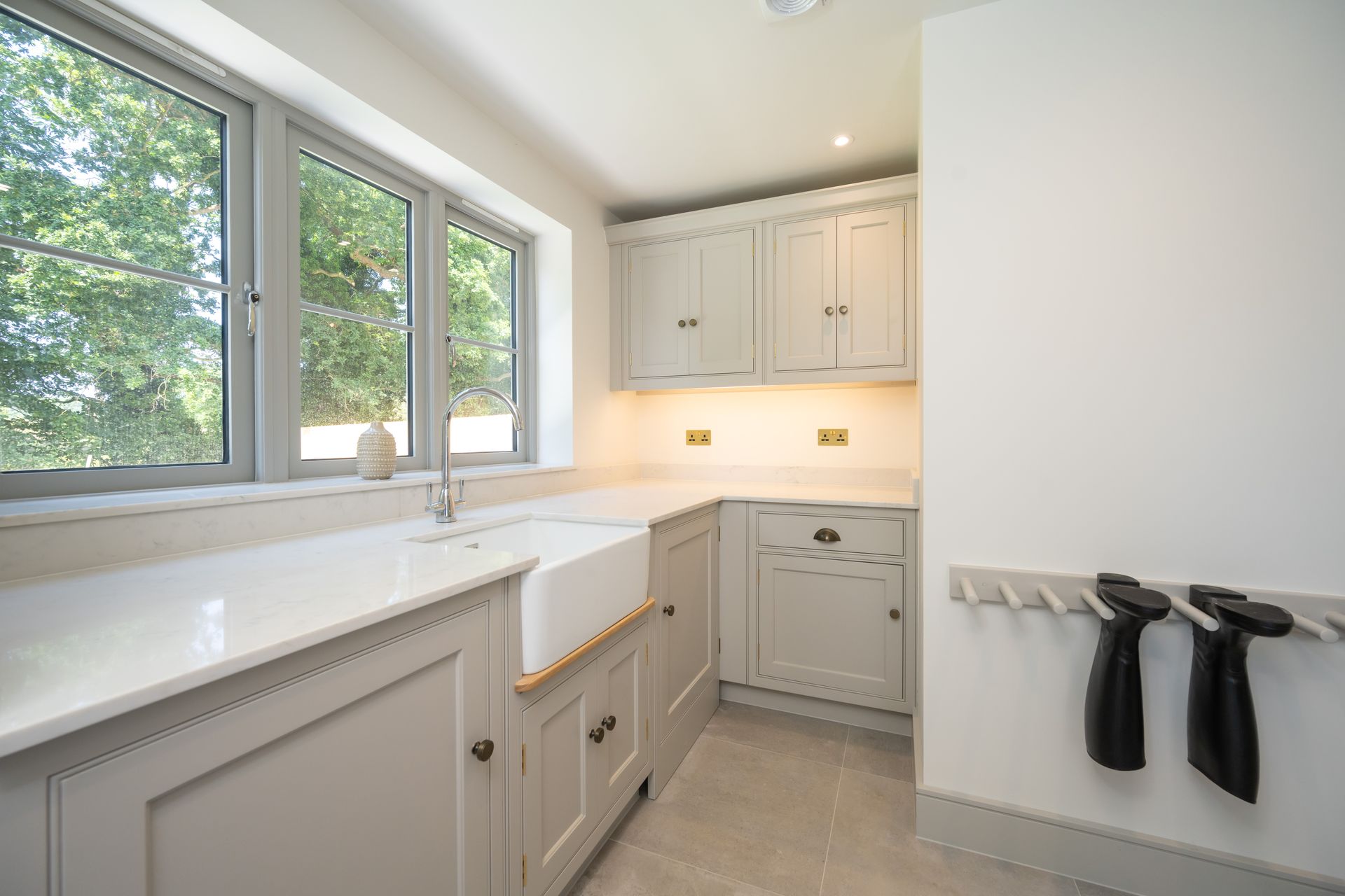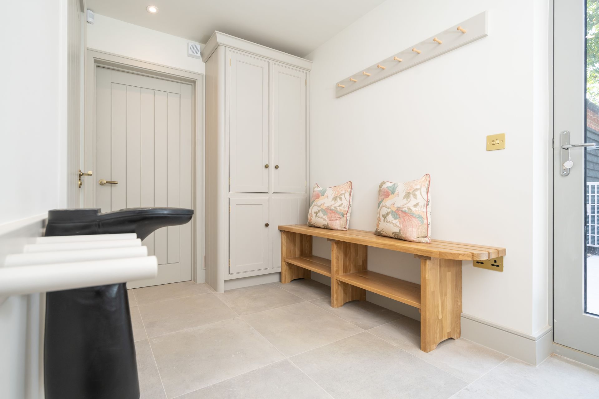 The spray-painted furniture continues into adjacent areas, including a bespoke utility space featuring a Belfast sink with a curved-fronted wooden bench, natural oak accents, and coordinated American bronze hardware. Functional features such as shaker pegs, welly racks and a bespoke tall comms cupboard keep everyday items in order without compromising on aesthetic appeal. The bench is carefully designed to integrate with the blanked-out cupboard panel, maximising both form and function.