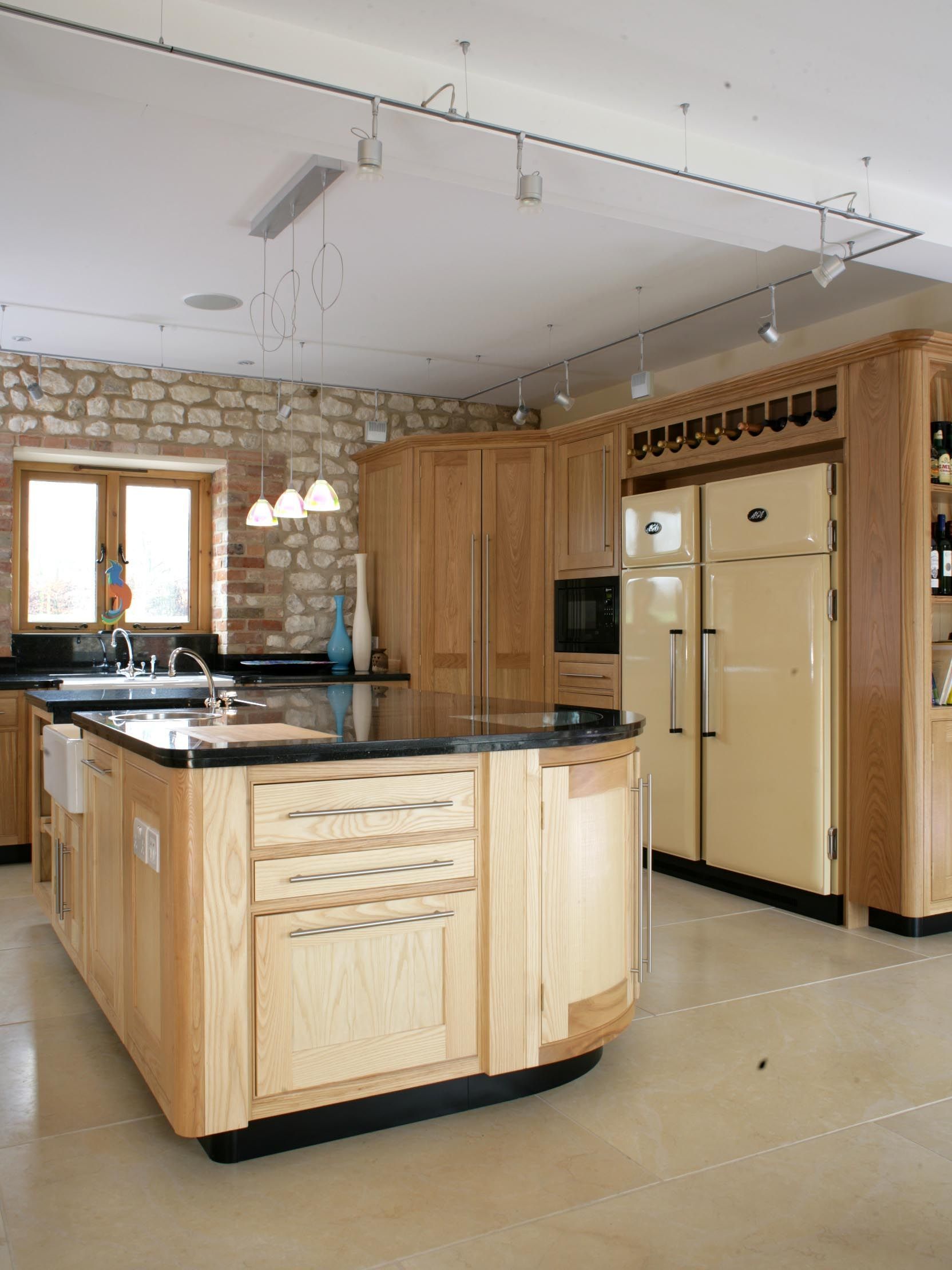 Set within a stunning barn conversion, this modern rustic kitchen blends natural materials with elegant design. The mix of lacquered oak and ash cabinetry creates a soft two-tone effect, enhanced by exposed brick and stone walls that provide a striking, textured backdrop.