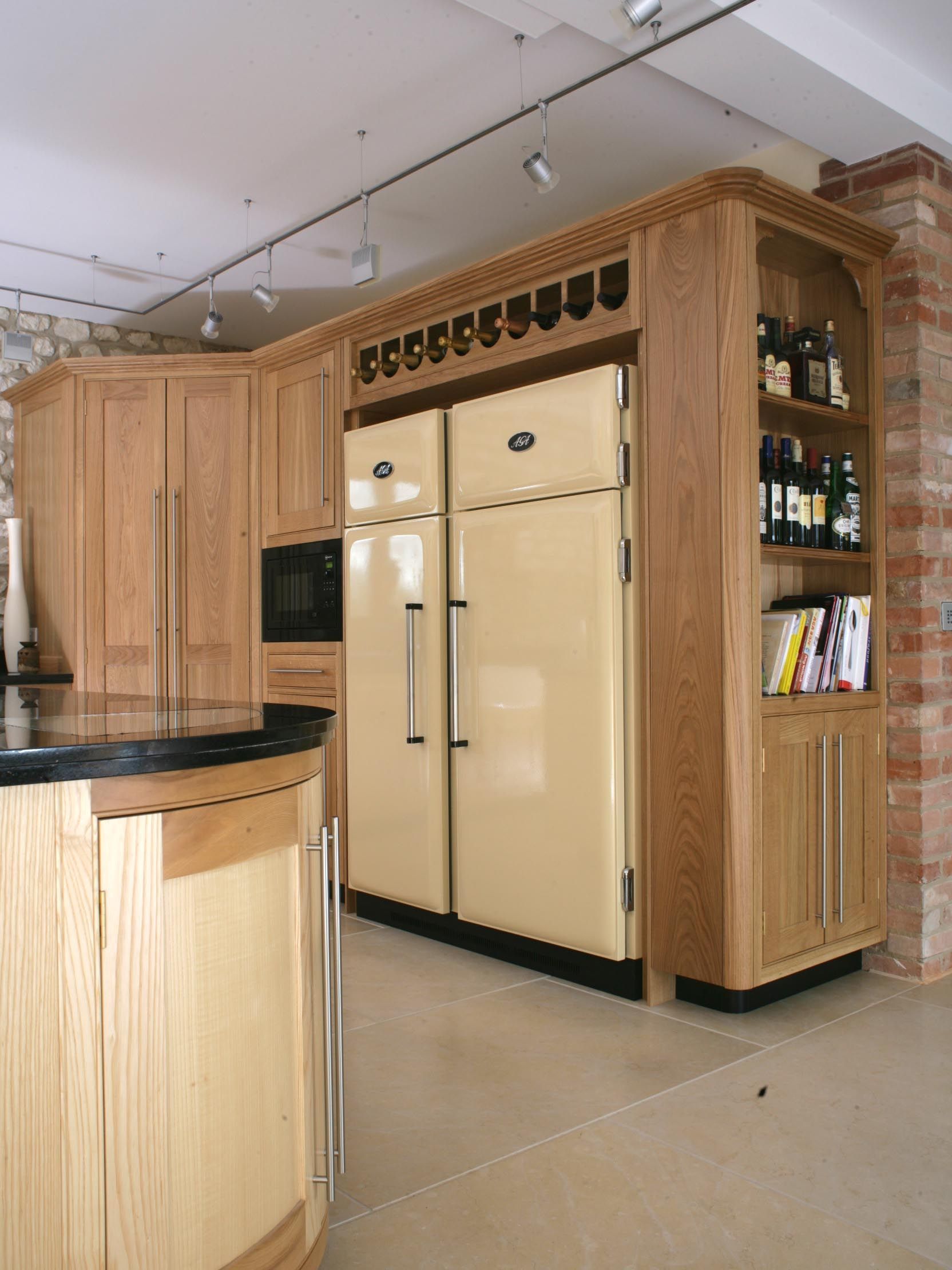 A tall bank of cabinetry houses an AGA fridge and freezer, framed by a dovecote-style wine rack and finished with practical open shelving and a display cupboard facing the room.
